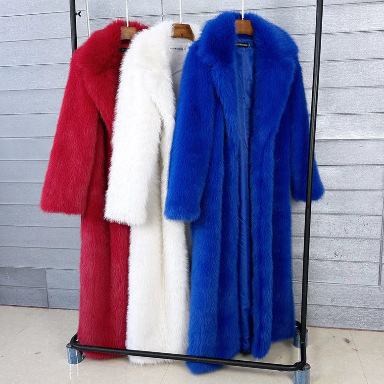 Long Faux Fur Coat Women Autumn Winter Large Jacket Overcoat White Turn Down Collar Pockets Thick Coat Warm Jackets Maxi Coats